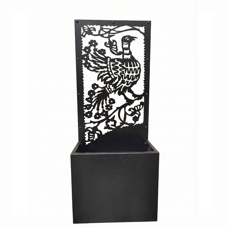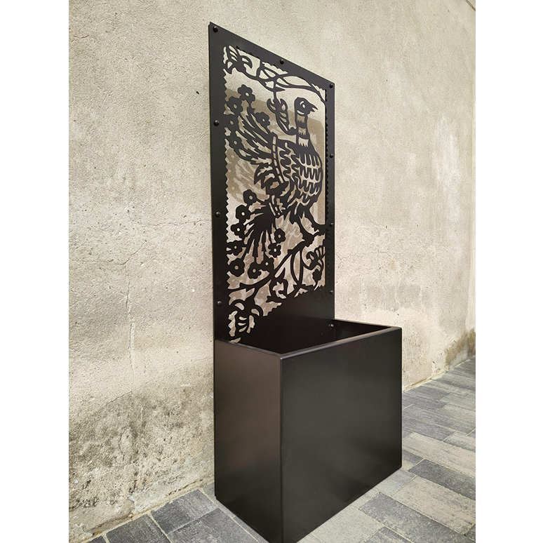 Ta artystyczna donica z panelem dekoracyjnym przedstawiającym ptaka to wyjątkowa ozdoba, która nada charakteru każdemu ogrodowi lub tarasowi. Czarna, solidna konstrukcja łączy funkcję pojemnika na rośliny z efektowną, metalową rzeźbą w formie ażurowego obrazu. Jest to doskonała propozycja dla osób poszukujących niebanalnych rozwiązań, które w elegancki sposób łączą naturę z nowoczesnym designem.