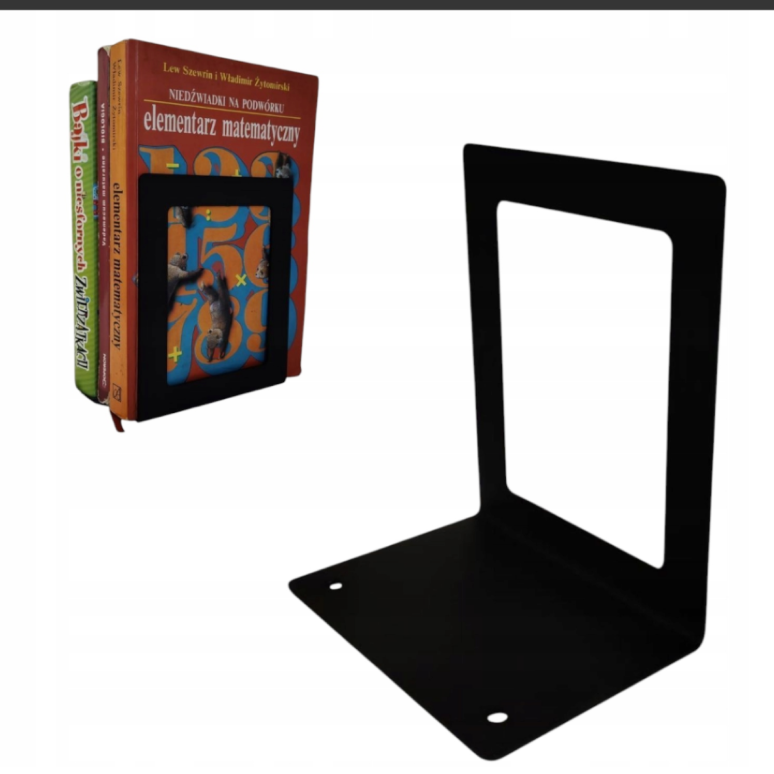 Metalowa podpórka na książki loft. Minimalistyczny, nowoczesny design w czarnym kolorze. Solidna konstrukcja oraz zestaw montażowy w komplecie zapewniają łatwy montaż i trwałość użytkowania.