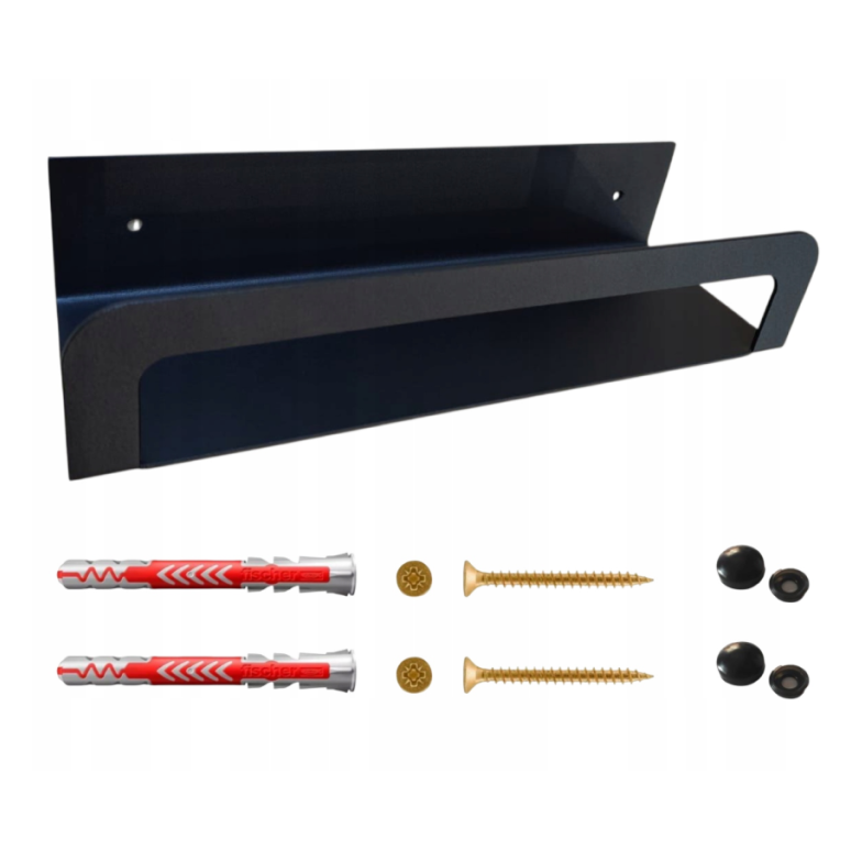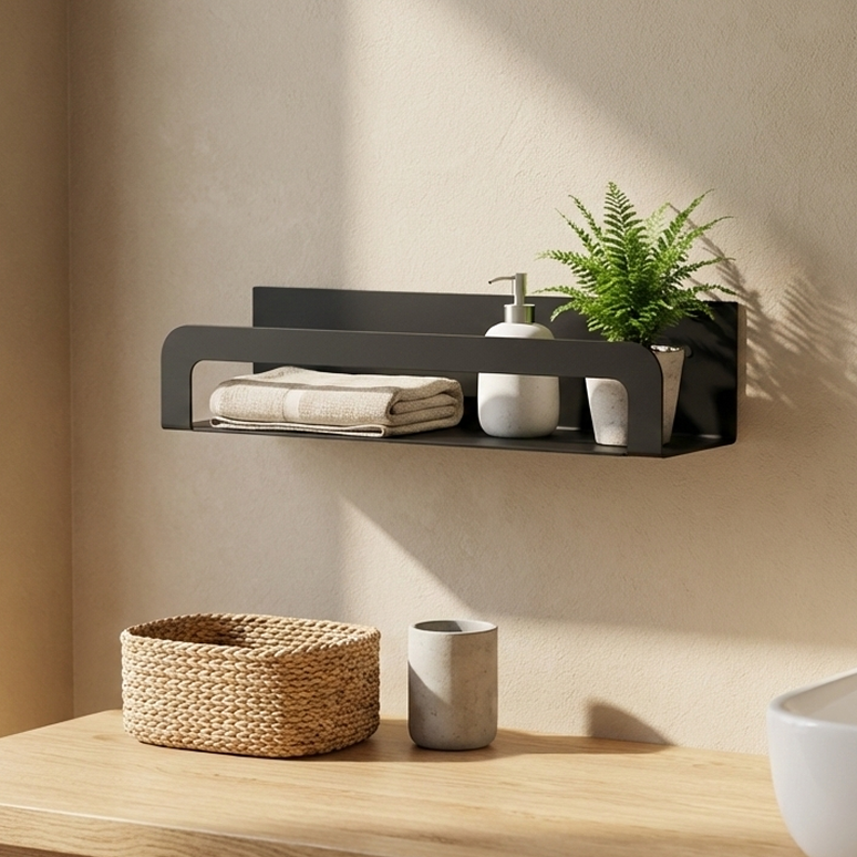 Metalowa półka pod lustro. Minimalistyczny, nowoczesny design w czarnym kolorze. Solidna konstrukcja oraz zestaw montażowy w komplecie zapewniają łatwy montaż i trwałość użytkowania.