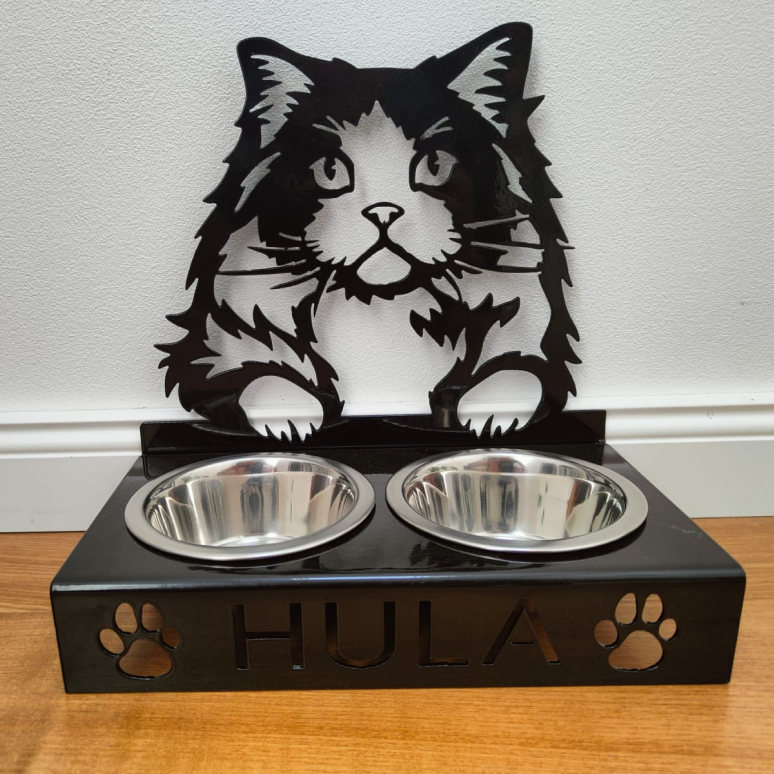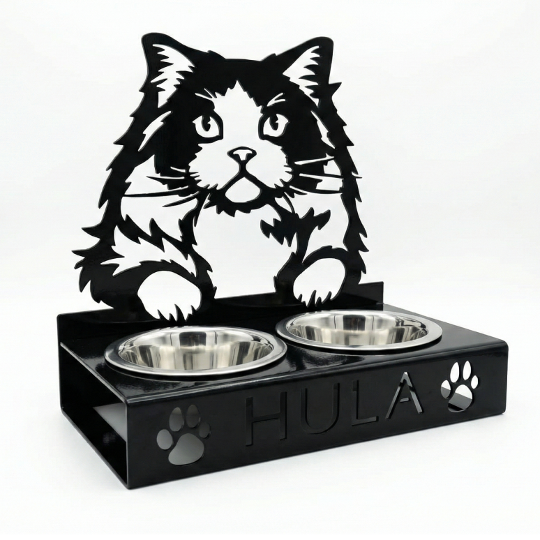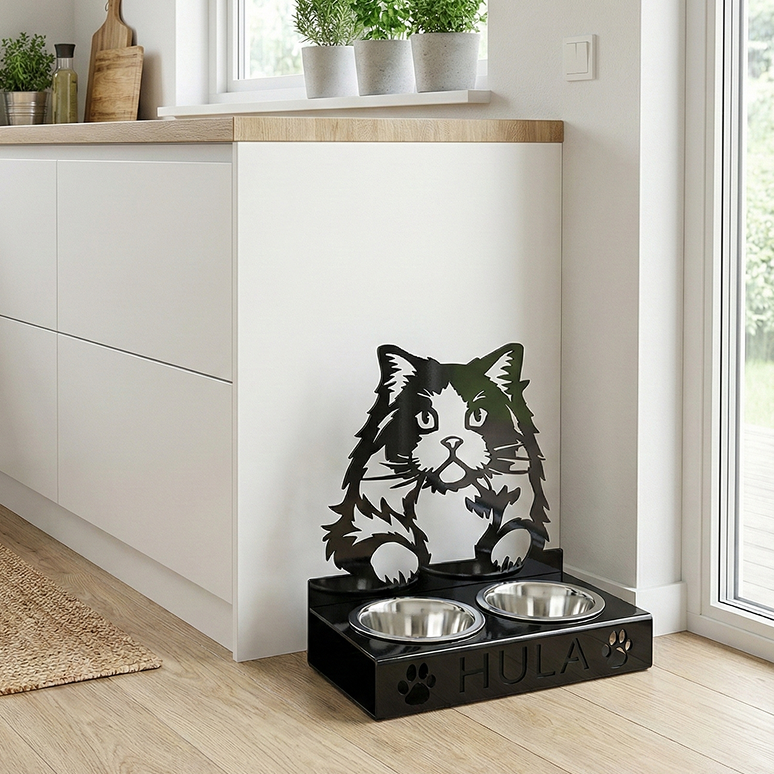 Ten uroczy stojak na miski z sylwetką puszystego kota łączy w sobie funkcjonalność z nowoczesnym designem. Czarna, stabilna konstrukcja wyposażona w dwie stalowe miseczki została ozdobiona wyciętym imieniem oraz motywem łapek, co nadaje jej wyjątkowego, osobistego charakteru. Jest to idealne rozwiązanie zapewniające pupilowi wygodę podczas jedzenia, a jednocześnie stanowiące elegancką dekorację domowej przestrzeni.