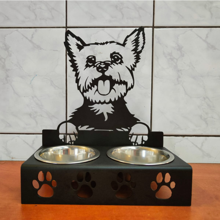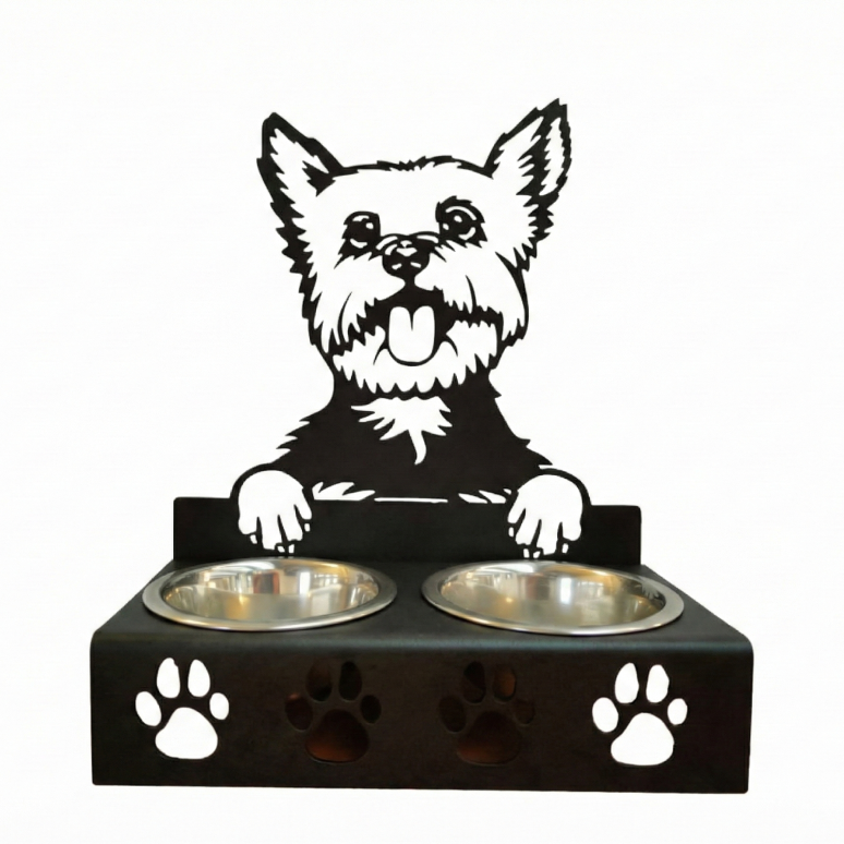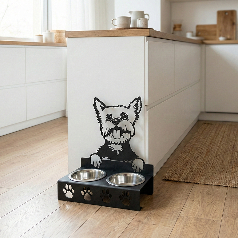 Ten uroczy stojak na miski z sylwetką radosnego teriera to doskonały wybór dla właścicieli mniejszych psów, takich jak York czy Westie. Solidna, czarna podstawa mieści dwie stalowe miseczki i została ozdobiona na froncie estetycznymi wycięciami w kształcie psich łapek, zastępującymi w tym wariancie imię. Jest to funkcjonalny dodatek, który ułatwia pupilowi jedzenie, jednocześnie wprowadzając do wnętrza wesoły i przytulny akcent.